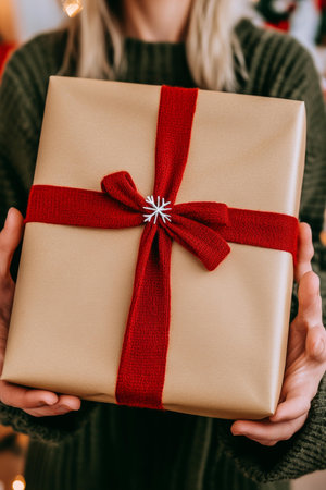 Woman holding wrapped present box with red ribbon, gift-giving theme