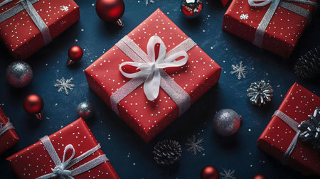 Festive Christmas gifts arranged beautifully with silver ornaments and decorations on dark blue background