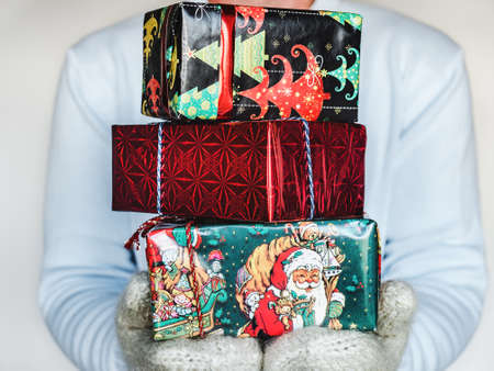 Christmas season approching. Colorful gift boxes, packed presents with Christmas style packing paper and ribbons.