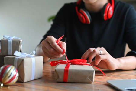 Photo of a young man with a wireless headphone unwarping a Christmas present box at the wooden table.