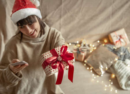 Young woman wearing a santa claus hat holding a beautifully wrapped christmas gift. Concept of celebrating christmas during coronavirus pandemic.