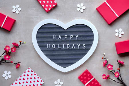 Text Happy Holidays. Chinese New Year festival decorations. Deco plum blossoms and gift boxes. Holiday background with felt heart shaped letter board, letterboard. Winter, Spring flat lay.