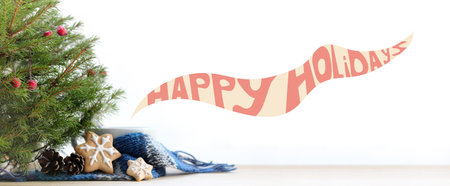 Happy holidays text handwritten on cotton bag with green spruce branches, gingerbread cookies and pine cones on sweater. Greeting card, modern seasons greetings