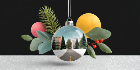Collage winter ornament with snowy street pine branches holly and citrus creating cozy festive scene full of calm seasonal charm