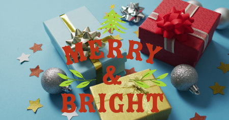 Image of merry and bright text over christmas decorations. Christmas, celebration and digital interface concept digitally generated image.