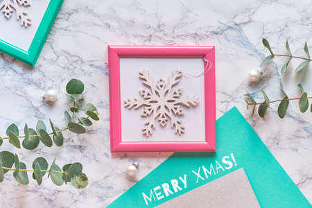 Geometric Christmas flat lay top view with pink and green frames and green paper. Fresh eucalyptus twigs and decorative white sparkling snowflake in pink frame. Flat lay on light marble background.