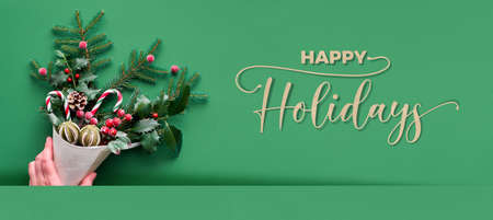 Christmas panoramic background flat lay on green paper with text Happy Holidays. Hand holding veneer cone with fir and holly twigs decorated with candy canes and berries. Panoramic composition.