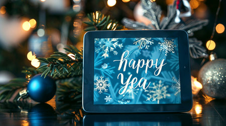 Tablet pc with Happy New Year text on screen and Christmas tree on background