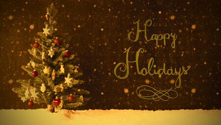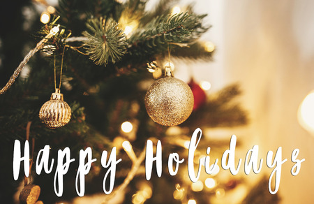 Happy Holidays text on christmas tree with ornaments,baubles, golden lights in festive room. Season's greetings card. Merry Christmas and Happy New Year