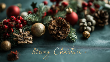 Printed Season's greetings text lying on burgundy table, with pine foliage red berries pine cones. Festive, holiday, winter, decoration, seasonal, craft, traditional