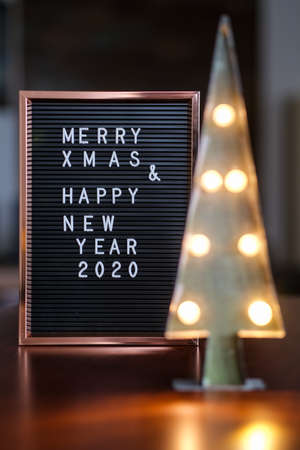 Merry Christmas lettering in plastic letters on an old vintage letter board. Top view. Flatley. Christmas greeting card.