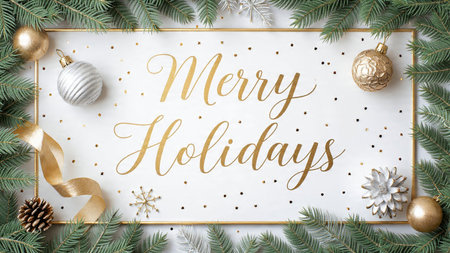 Happy Holidays text on white background with christmas tree branches.