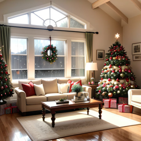 Cozy Christmas setting with a decorated tree, ornaments, and presents in a beautifully adorned home for the Nativity feast.