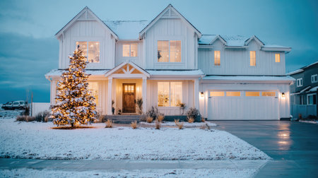 A well-lit house is shown during winter night. A Christmas tree stands outside in the snow. The exterior features white siding, a garage, and multiple windows. The scene suggests a festive holiday atmosphere suitable for seasonal marketing or editorial content about homes and celebrations.