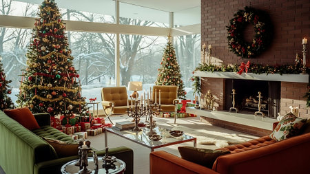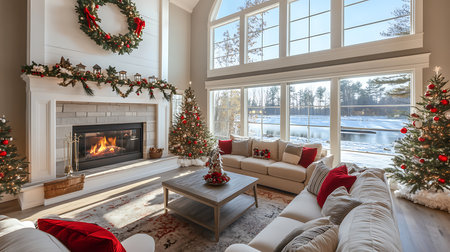 A warm and inviting living room filled with Christmas cheer, boasting a magnificent view of a snowy winter landscape