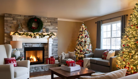 A living room interior is depicted with Christmas decorations. The room features a fireplace, a Christmas tree, and window views. Colors include greens, browns, and reds creating a warm atmosphere. The scene suggests festive celebrations, suitable for commercial or editorial applications related to holidays or home decor.