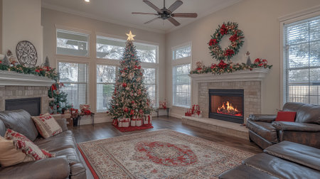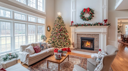 A spacious living room is decorated for Christmas with a large, ornately decorated Christmas tree, a fireplace with stockings hung above, and a comfortable sofa and chairs. The room is filled with natural light from the large windows. The warm glow of the fireplace creates a cozy and inviting atmosphere.