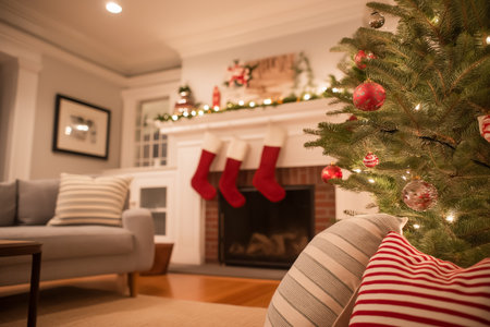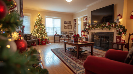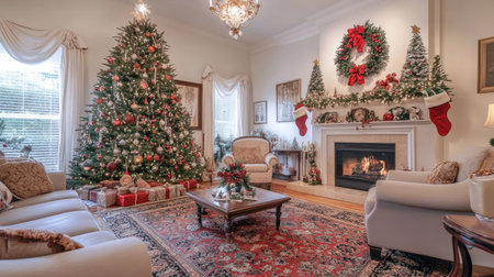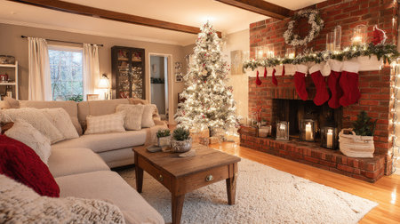 A cozy living room beautifully decorated for Christmas, featuring a festive tree, stockings, and a warm fireplace, inviting family gatherings and holiday cheer.