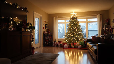 Festive holiday decorations in a house with a glowing Christmas tree, garlands, and gifts, celebrating the joy of the Nativity feast.