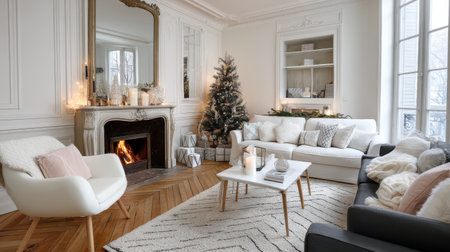 Warm and inviting living space features a beautifully decorated Christmas tree, elegant furniture, and a cozy fireplace. Soft textures and winter decor enhance the festive ambiance