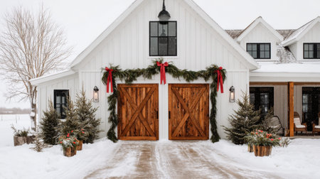 A picturesque winter scene featuring a rustic barn adorned with holiday decorations, surrounded by snow-covered trees, evoking a warm festive atmosphere.