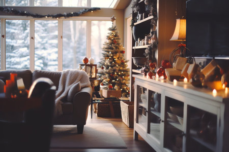Christmas living room with a softly blurred tree in the background, showcasing festive holiday decor, perfect for creating joyful photo backgrounds.