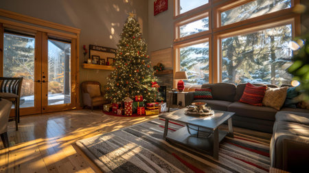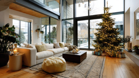 This elegant living room showcases a beautifully decorated Christmas tree, creating a warm and inviting atmosphere. Bright natural light floods the space, highlighting modern furnishings and cozy decor elements. Perfect for holiday celebrations and family gatherings.