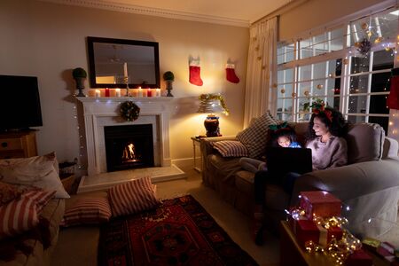 Front view of a mixed race woman sitting on a sofa with her young daughter in their sitting room at Christmas, using a laptop computer smiling and wearing festive hats
