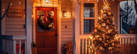 House door and entrance in a Californian setting are adorned with festive Christmas decorations, AI-generated image