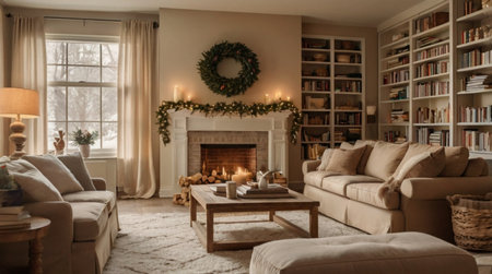 A cozy winter living room featuring rustic decor with soft lighting, festive greenery, and a warm inviting atmosphere perfect for relaxation.