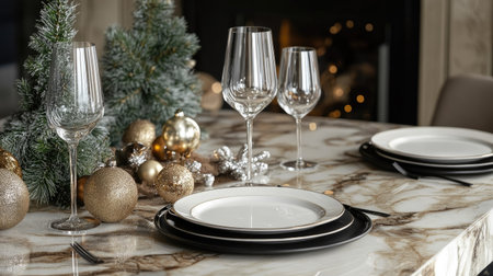 A Lavish New Year's Eve Celebration Table Setting, Adorned with Elegant Glassware, Sparkling Decorations and Festive Party Favors