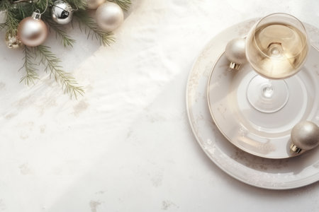 Christmas festive table setting with champagne. Holiday dinner home party. Generative AI illustration