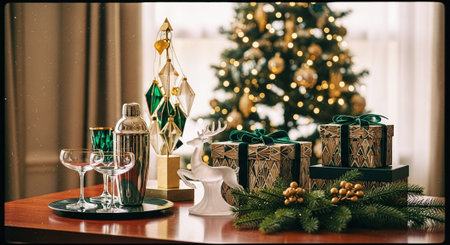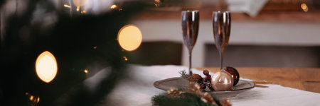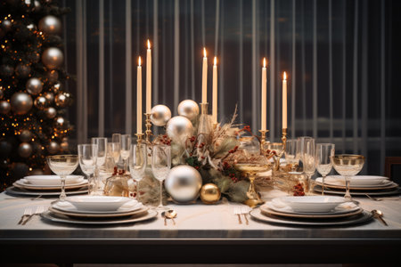 Elegant Christmas dinner table setting with crystal glasses, pine garland, golden candles and ornaments. Softly lit tree creates magical bokeh background in sophisticated dining room.