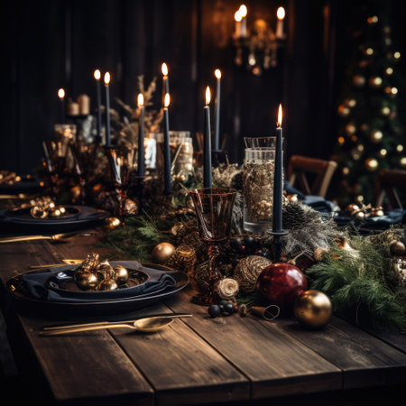 A beautifully arranged holiday table featuring elegant candles, gold ornaments, and a cozy atmosphere, perfect for winter celebrations and festive gatherings.