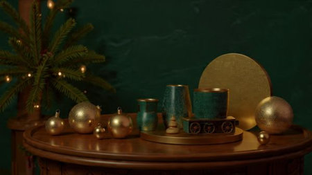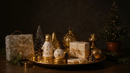 Stunning display of Christmas ornaments and decorations featuring a golden tree, shimmering baubles, and a blue marble gift box, perfect for holiday joy.