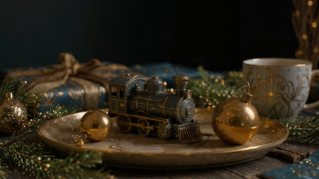 Vintage toy train on a golden plate with Christmas decorations on a dark background