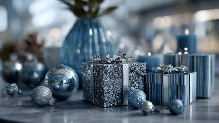 Colorful ornaments pine cones and wrapped gifts create a lively New Year atmosphere. This scene captures the spirit of holiday cheer and excitement.