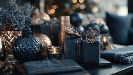 Timeless black & gold holiday styling with elegant gift wrapping.