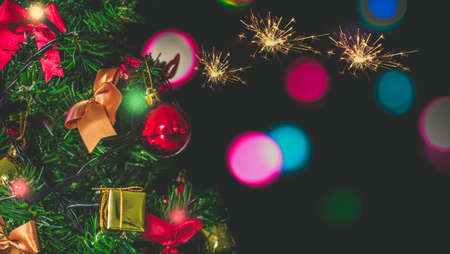 Blurred colorful lights abstract background with christmas tree and ornamental decorations.
