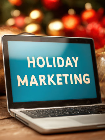 A laptop with a clear screen reflecting holiday marketing strategies rests on a wooden table, surrounded by festive decorations and lights.