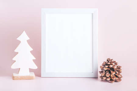 Christmas mockup frame with ceramic Christmas tree and pine cone on pastel pink background. Minimalistic Christmas card with modern decor, copy space