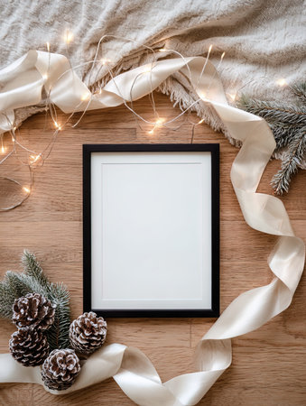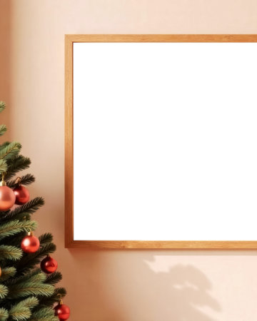 A photo frame mockup with an empty white canvas, placed on the floor beside Christmas decorations like lights and ornaments. The frame is made of light wood, adding warmth to its design. This scene creates a festive atmosphere for the New Year's celebration. --chaos 30 --ar 16:9 --v 6.1 Job ID: 9c8b223f-fc61-4810-9848-cd89ed9aa24b