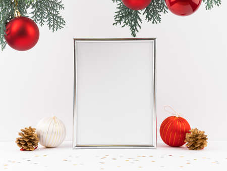 Blank silver photo frame mockup template and christmas decoration on red blackground.