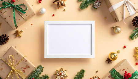 Christmas or New Year flat lay top view Xmas holiday celebration greeting card mockup with blank white photo frame, fir tree branches, gift boxes and decorations on pastel beige