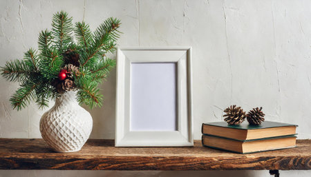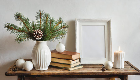 Winter still life. Horizontal white frame mockup on vintage wooden bench, table. Modern white ceramic vase with pine tree branches, Christmas paper ornaments and books. White wall background.