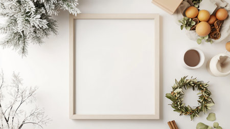 Flat lay photo of an empty large picture frame, winter theme. Generative AI