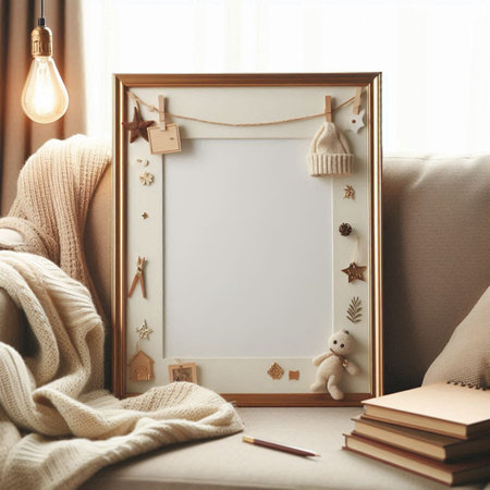 Blank photo frame mockup with Christmas decorations. Cozy home interior