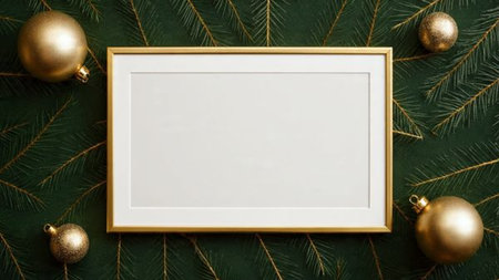 A classic Christmas mockup with evenly spaced pine branches and shimmering ornaments along both sides.