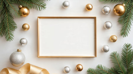 white picture frame with Christmas balls decoration pines on white background, minimal concept. top view, christmas holiday season.