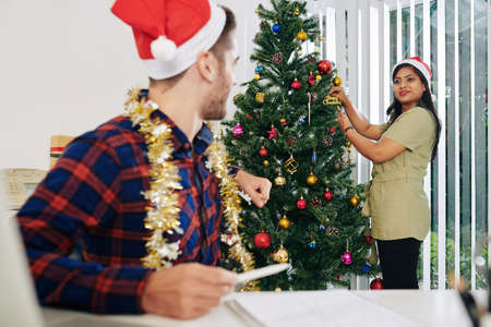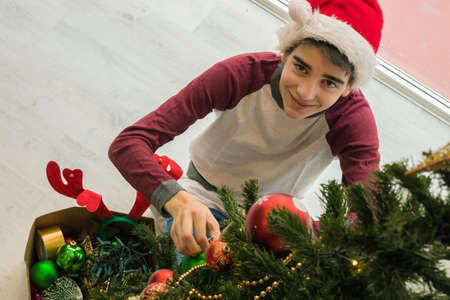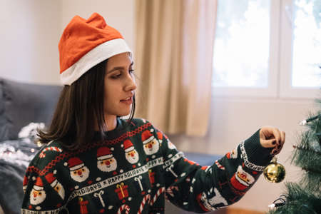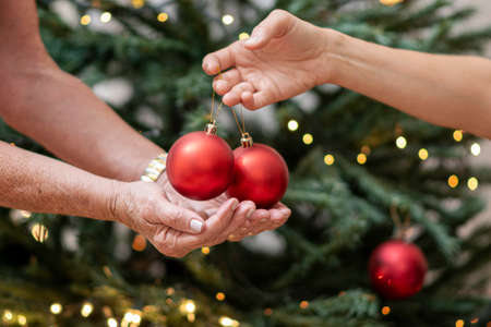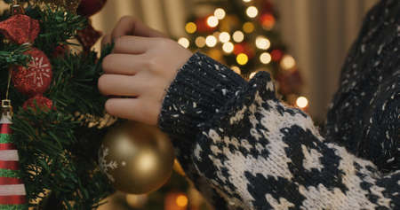 Hanging Christmas decorations and ornaments in the Christmas tree